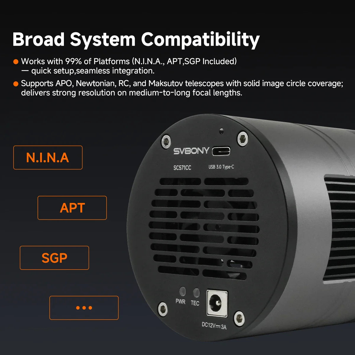 - Fonctionne avec logiciels d’imagerie tels que N.I.N.A., APT, Sequence Generator Pro