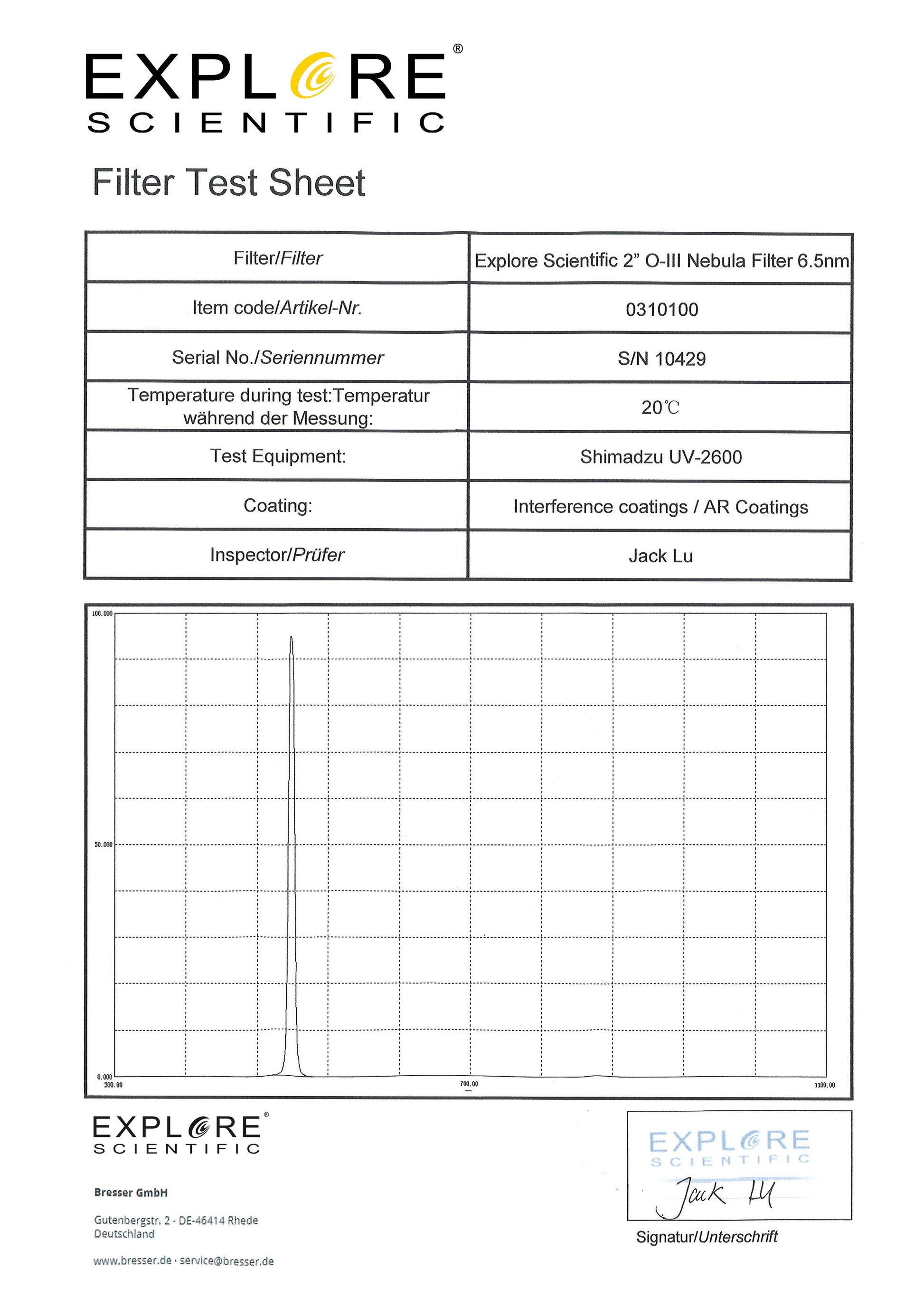 Filtre pour Nébuleuse O-III 2" 6.5nm - Explore Scientific