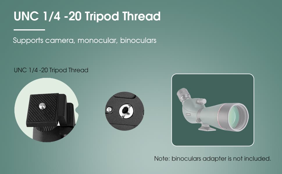 - Compatible with monoculars, binoculars, and spotting scopes equipped with UNC threads