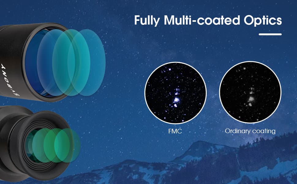 - 8x50 tähtäin, jossa on suuri 50 mm objektiivilasi, joka päästää sisään enemmän valoa, tarjoten siten kirkkaan ja helposti kohdistettavan kuvan taivaalla.
