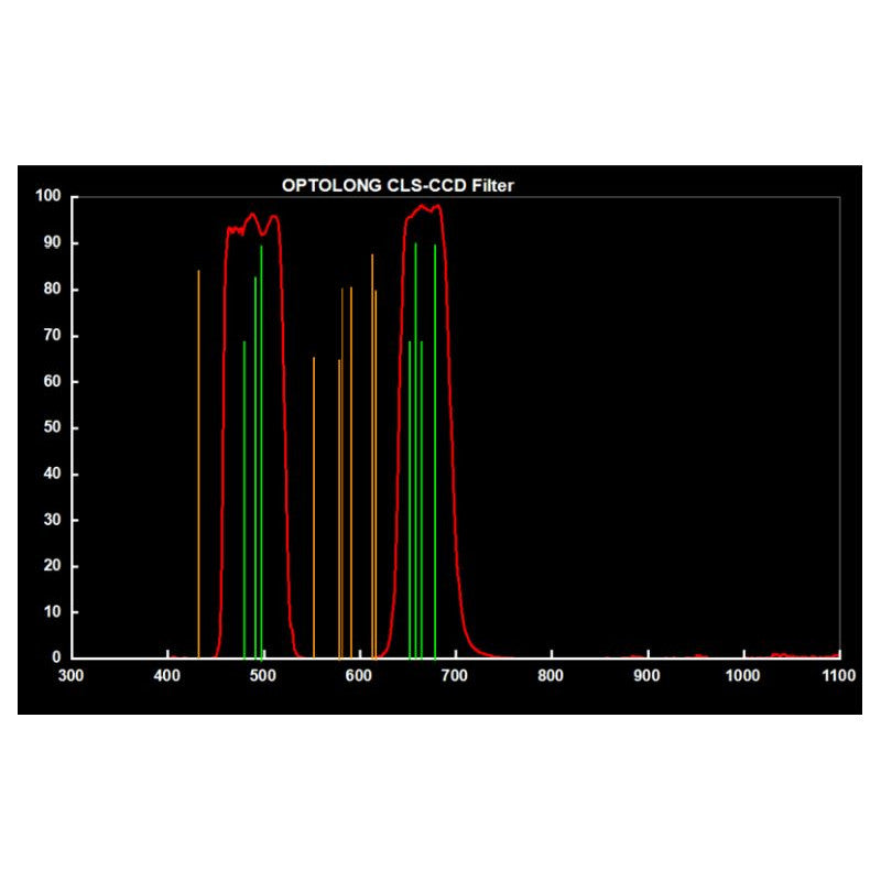 Résumé descriptif en français du filtre CLS-CCD d'Optolong pour Canon EOS APS-C, destiné à l'astronomie. Le filtre de large bande City Light Suppression (CLS) réduit les longueurs d'onde de pollution lumineuse et améliore le contraste des objets Deep-Sky, tout en conservant les étoiles et les détails pour l'observation et l'astrophotographie.