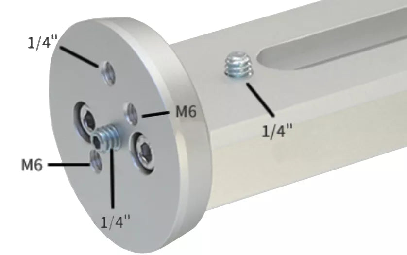 - Skylės: 1x 1/4 colio, 1x 1/4 colio išorinis thread, 2x M6 vidinis thread plokštėje