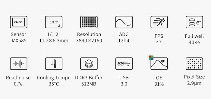- Capteur CMOS couleur Sony IMX585 de 8,29 Mpx (3840 x 2160px)