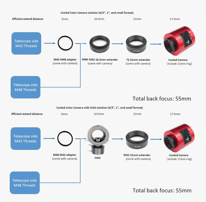 - Filetage M42x0.75 femelle avec backfocus de 17,5 mm ou M42x0.75 mâle avec backfocus de 6,5 mm
