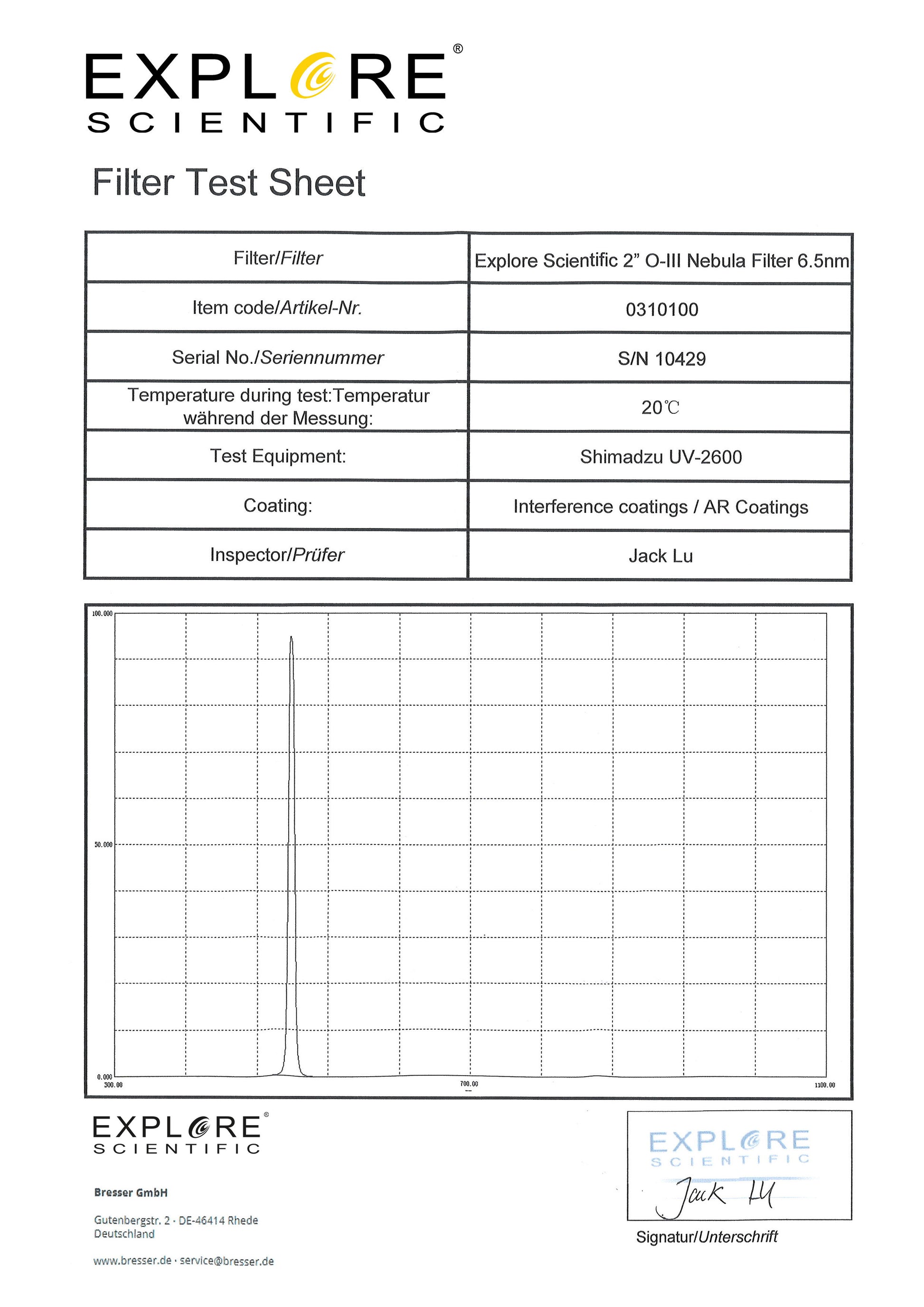 Filtre pour nébuleuse O-III 50,8 mm 6,5 nm - Explore Scientific