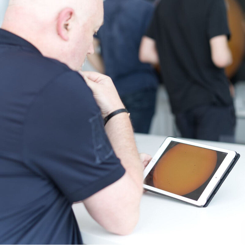 Photographiez le soleil avec la Vespera. La fonction « pointage solaire » vous permet d'observer le soleil quasiment en temps réel sur l'écran en direct. Vous pouvez prendre des photos à tout moment via l'appli Singularity. Prenez plusieurs photos à différents moments de la journée, de la semaine ou du mois et comparez vos photos. Observez comment l'activité du soleil évolue avec l'apparition ou la disparition de taches solaires. Ces taches solaires peuvent avoir une durée de vie de plusieurs jours, plus rarement de plusieurs semaines.