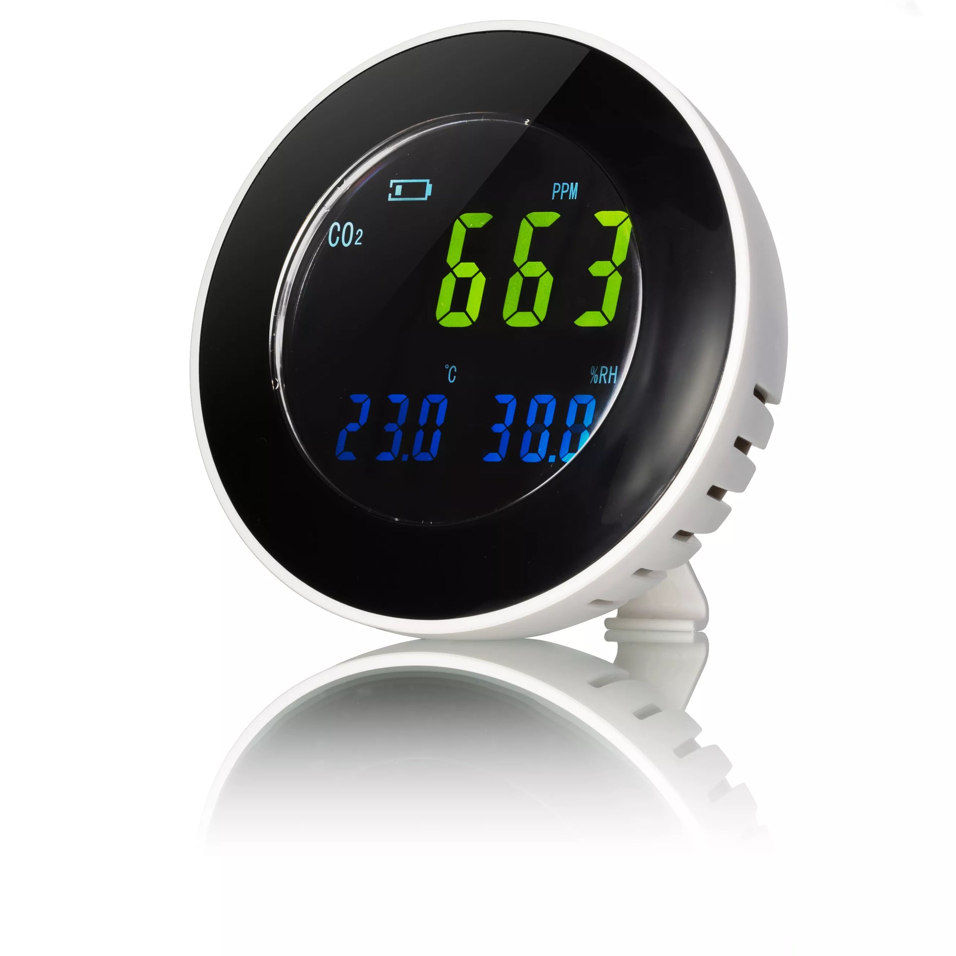 - Affichage simultané de la concentration en CO2, température (°C/°F) et humidité