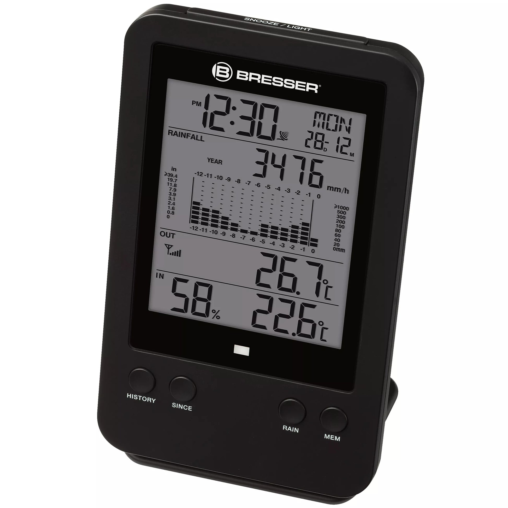 Le pluviomètre numérique radio-piloté de BRESSER offre la possibilité d'effectuer des mesures de précipitation professionnelles. Il affiche des relevés de pluie détaillés en millimètres, ainsi que les températures intérieures et extérieures avec précision.