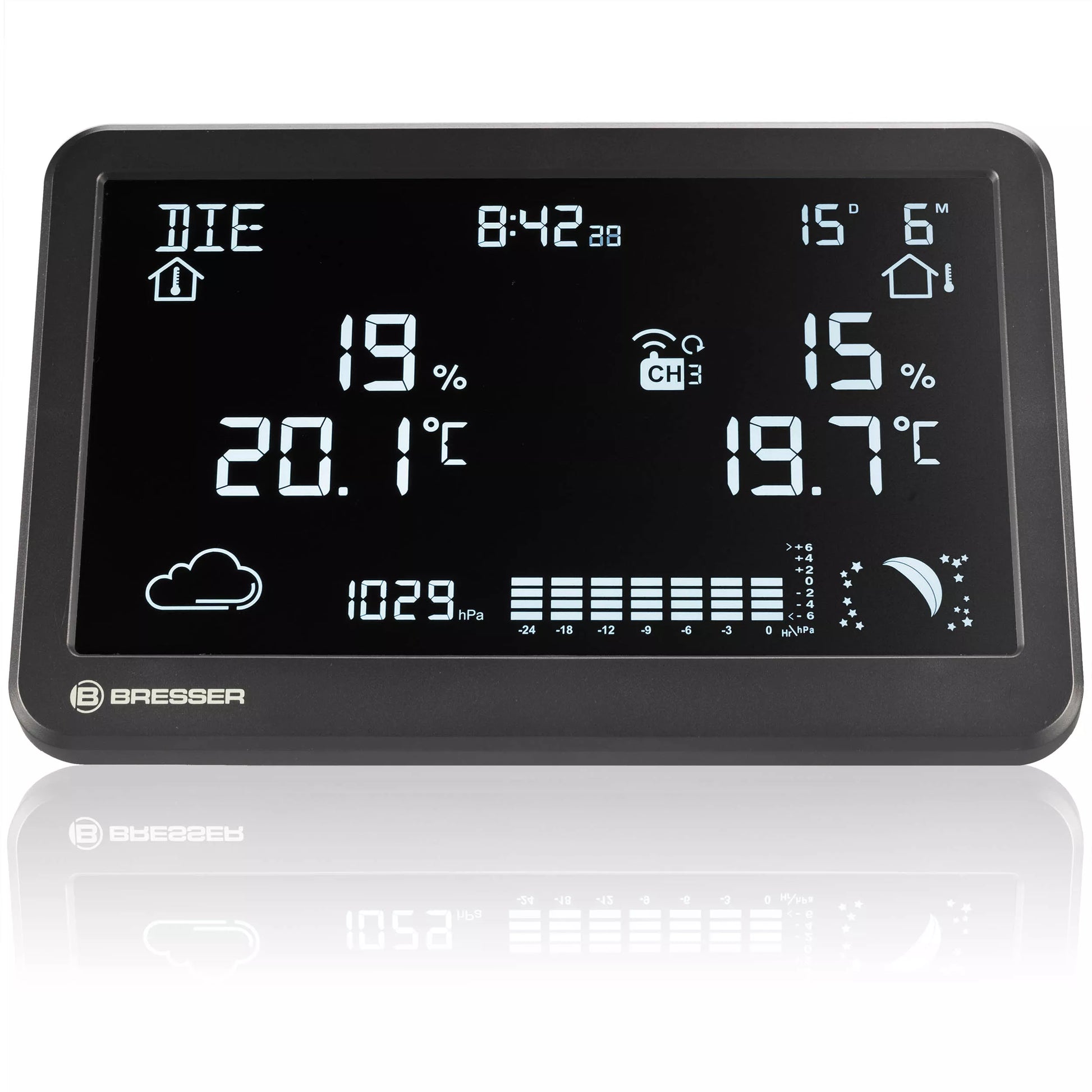 La station météo sans fil BRESSER MeteoTemp TBH vous permet de prévoir le temps qu'il fera avec sa fonction de prévision météorologique graphique. Vous pouvez ainsi décider en toute connaissance de cause si un manteau épais ou un chapeau de soleil sera votre compagnon.