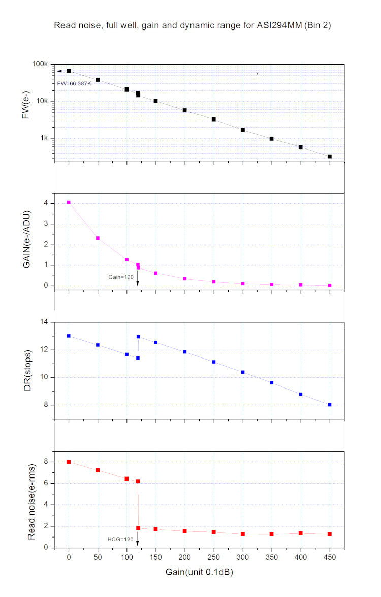 - Capacité du puits (full well) : 63700 électrons