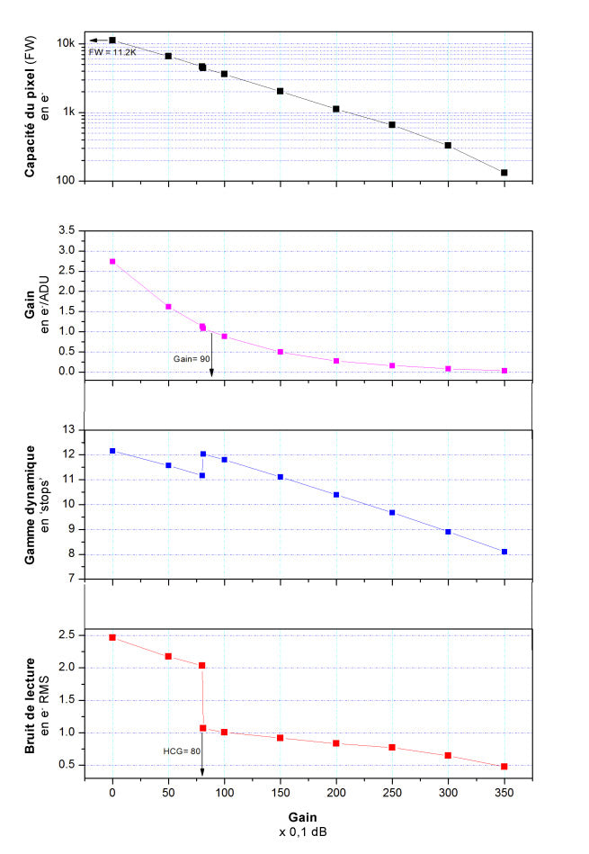 - Gain de 2,73 e-/ADU et bruit de lecture de 0,47 à 2,4 e-