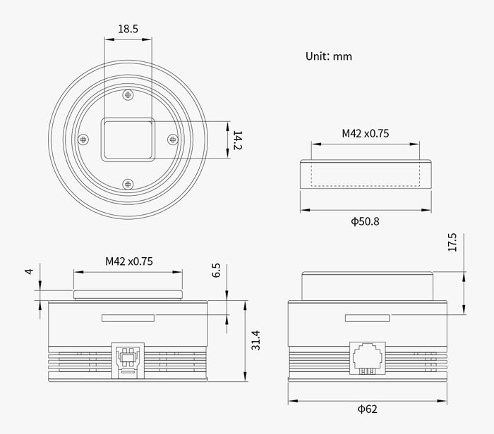 - Montage mécanique avec filetage M42x0.75 femelle et backfocus de 6,5 mm / 17,5 mm