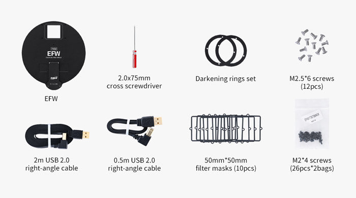 Améliorez vos sessions d'astronomie avec la Roue à filtres EFW ZWO 7 positions 7x50mm carrés. Cette roue à filtres robuste permet une gestion efficace de jusqu'à 7 filtres, garantissant une observation fluide et sans interruption.