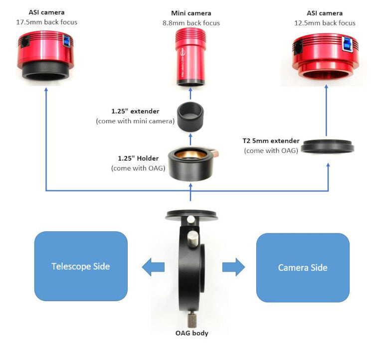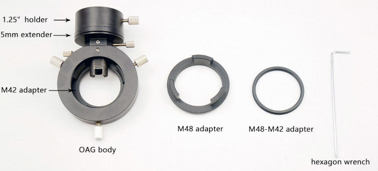 Conçu pour les astrophotographes exigeants, le diviseur optique ZWO OAG vous permet d'autoguider votre matériel d'astrophotographie avec une précision incomparable. Grâce à ses nombreux adaptateurs, il s'intègre facilement à divers trains d'imagerie. Disponible en version M68 pour les capteurs de grande taille tels que ASI6200/2600/2400. La sortie de l'OAG ZWO est réglable en M42 ou M48 en changeant la plaque arrière. Assurez-vous que le capteur imageur et le capteur de guidage sont à la même distance pour une mise au point optimale.
