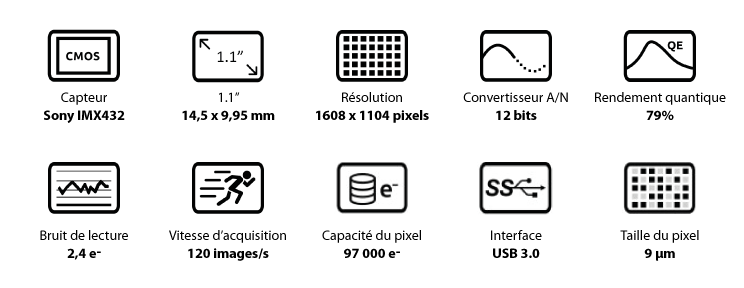 ZWO ASI432MM-kameran är utrustad med en monokrom CMOS-sensor med 1,77 miljoner pixlar (1608 x 1104 px) med en diagonal på 17,6 mm. Vid full upplösning når den en maximal bildfrekvens på 120 bilder per sekund med en dynamik på 12 bitar. Sensorstorleken och pixelstorleken (9 µm) gör den idealisk för sol- eller månobservationer. En global slutare underlättar fotografering av snabbt rörliga objekt, såsom solens yta eller artificiella satelliter. Dessutom har kameran en extremt låg läsljudnivå (2,4 e-) och stora kapacitetspixlar (97 000 e-), vilket garanterar skarpa och detaljerade bilder.